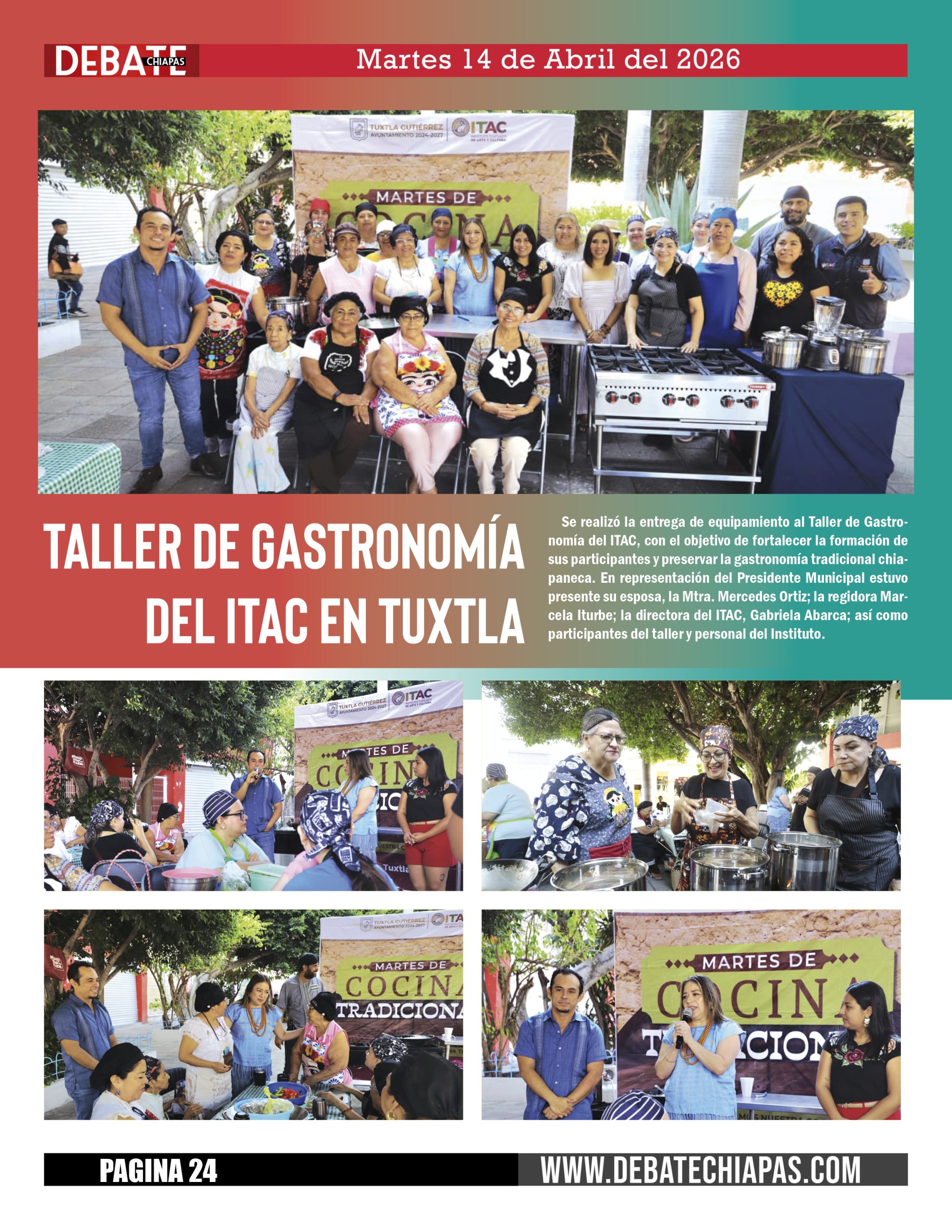 Se realizó la entrega de equipamiento al Taller de Gastronomía del ITAC, con el objetivo de fortalecer la formación de sus participantes y preservar la gastronomía tradicional chiapaneca. En representación del Presidente Municipal estuvo presente su esposa, la Mtra. Mercedes Ortiz; la regidora Marcela Iturbe; la directora del ITAC, Gabriela Abarca; así como participantes del taller y personal del Instituto.