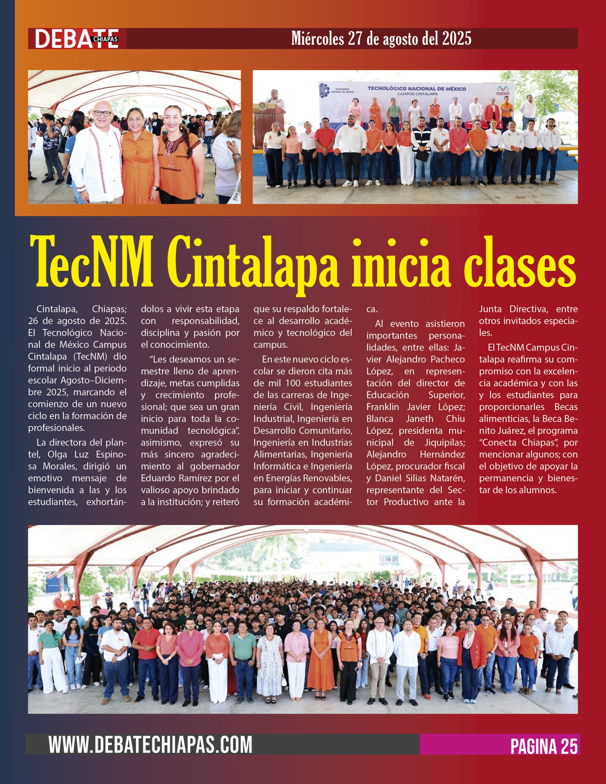 Cintalapa, Chiapas; 26 de agosto de 2025. El Tecnológico Nacional de México Campus Cintalapa (TecNM) dio formal inicio al periodo escolar Agosto–Diciembre 2025, marcando el comienzo de un nuevo ciclo en la formación de profesionales.