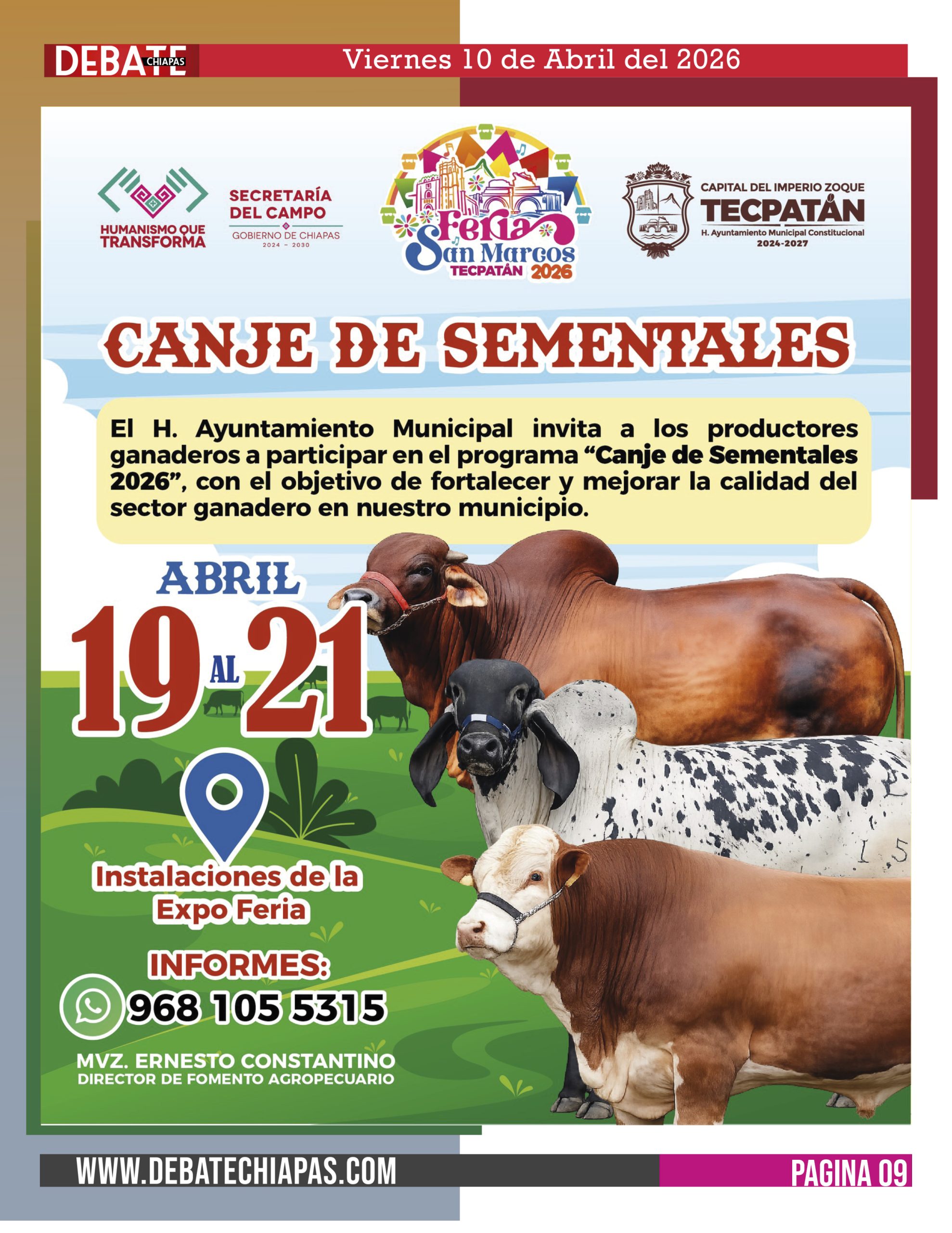 El H. Ayuntamiento Municipal invita cordialmente a todos los productores ganaderos del municipio a participar en el programa “Canje de Sementales 2026”, en el marco de la Feria San Marcos 2026.