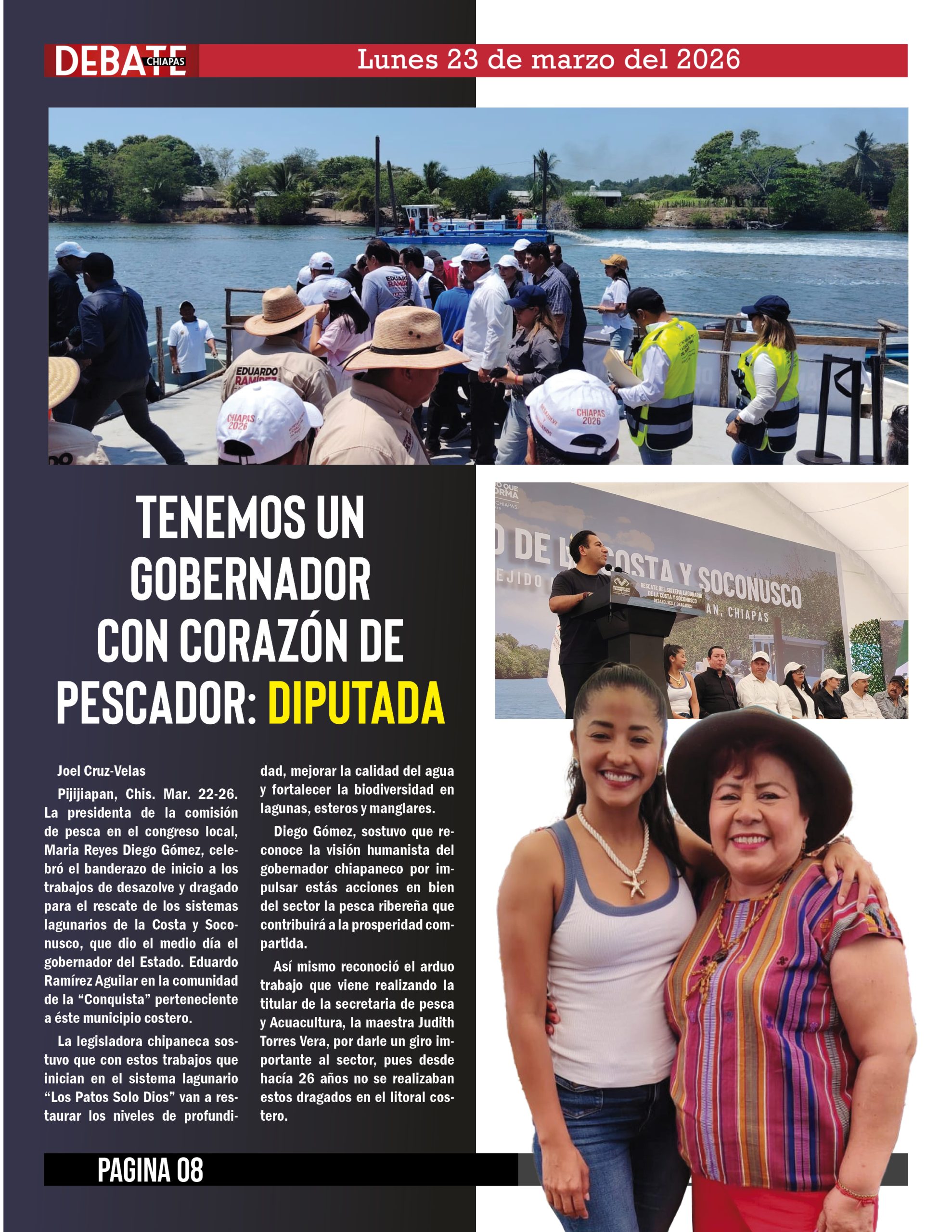 Pijijiapan, Chis. Mar. 22-26. La presidenta de la comisión de pesca en el congreso local, Maria Reyes Diego Gómez, celebró el banderazo de inicio a los trabajos de desazolve y dragado para el rescate de los sistemas lagunarios de la Costa y Soconusco, que dio el medio día el gobernador del Estado. Eduardo Ramírez Aguilar en la comunidad de la «Conquista» perteneciente a éste municipio costero.