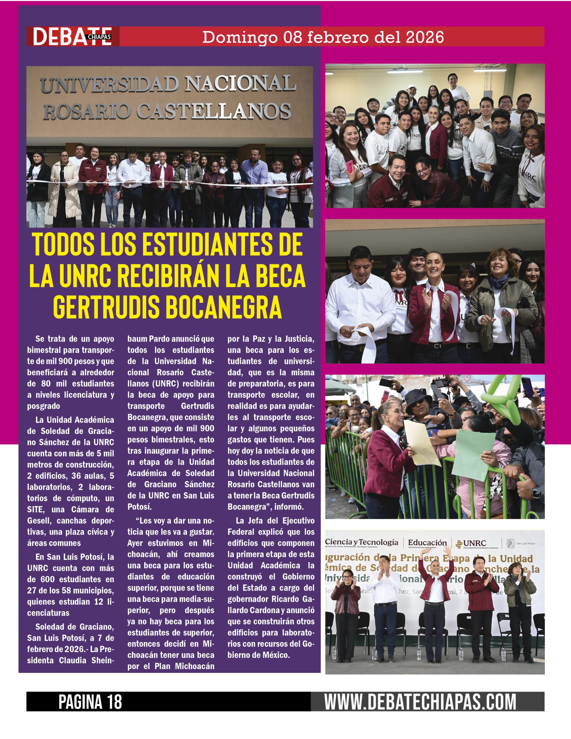 Soledad de Graciano, San Luis Potosí, a 7 de febrero de 2026.- La Presidenta Claudia Sheinbaum Pardo anunció que todos los estudiantes de la Universidad Nacional Rosario Castellanos (UNRC) recibirán la beca de apoyo para transporte Gertrudis Bocanegra, que consiste en un apoyo de mil 900 pesos bimestrales, esto tras inaugurar la primera etapa de la Unidad Académica de Soledad de Graciano Sánchez de la UNRC en San Luis Potosí.