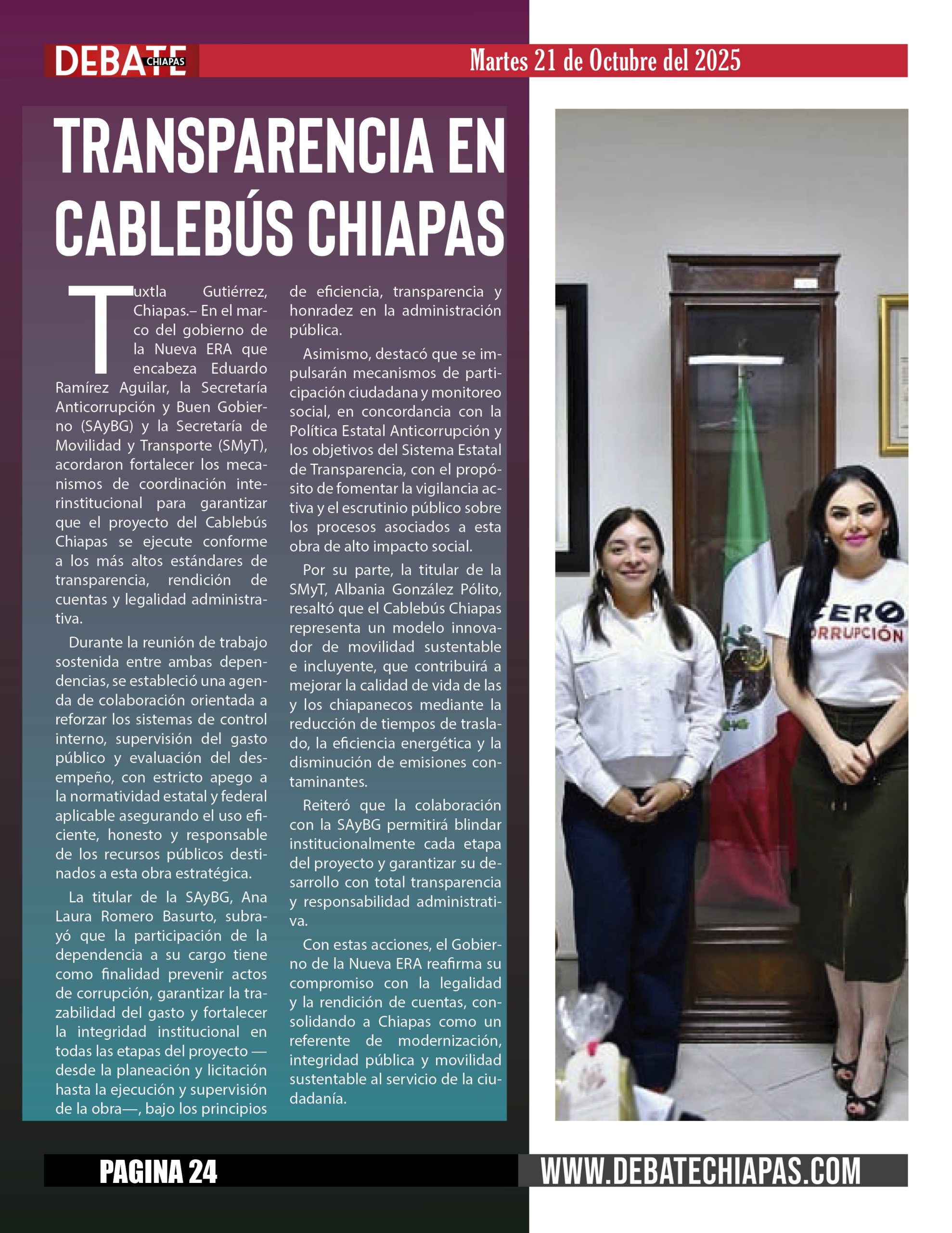Tuxtla Gutiérrez, Chiapas.– En el marco del gobierno de la Nueva ERA que encabeza Eduardo Ramírez Aguilar, la Secretaría Anticorrupción y Buen Gobierno (SAyBG) y la Secretaría de Movilidad y Transporte (SMyT), acordaron fortalecer los mecanismos de coordinación interinstitucional para garantizar que el proyecto del Cablebús Chiapas se ejecute conforme a los más altos estándares de transparencia, rendición de cuentas y legalidad administrativa.