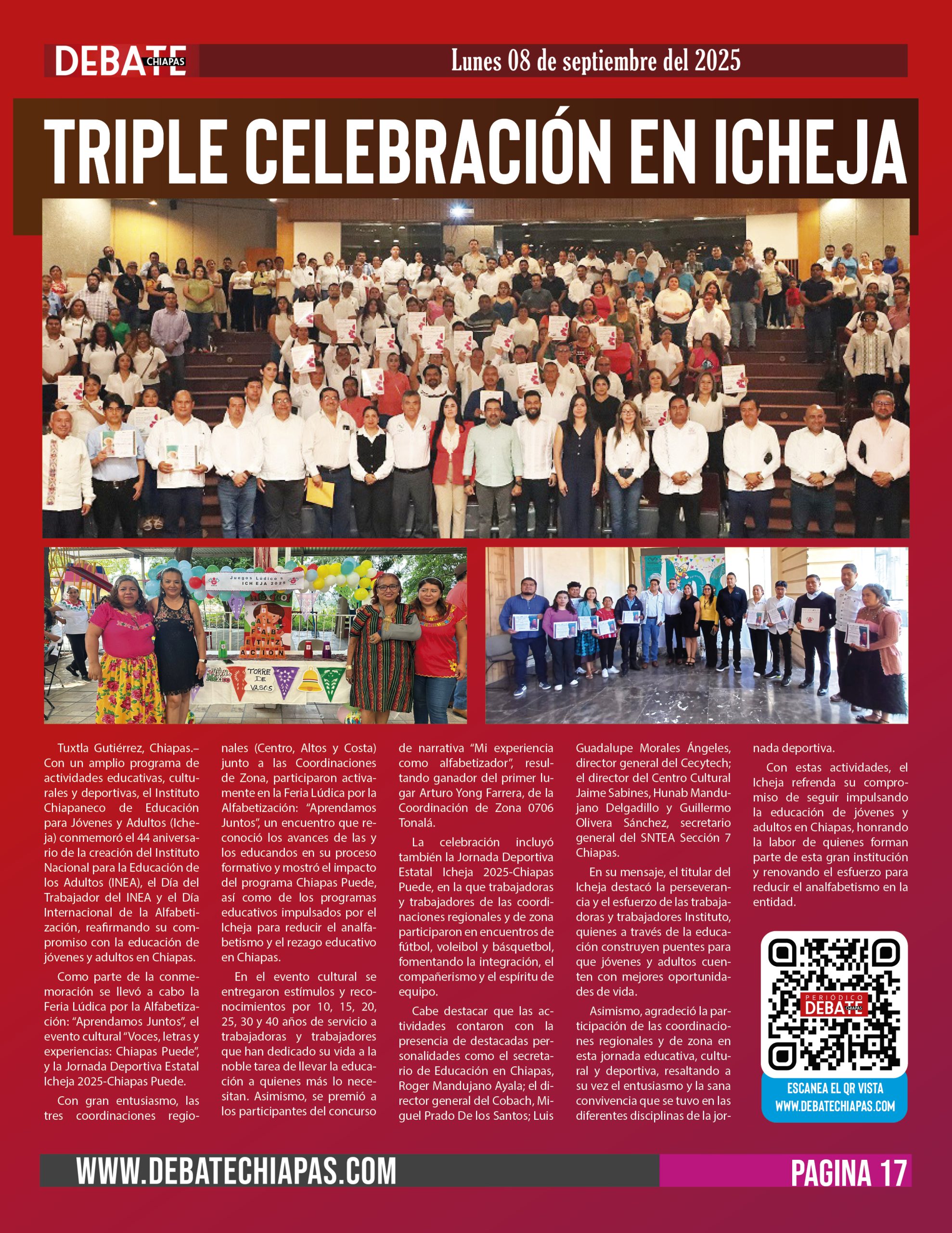 Tuxtla Gutiérrez, Chiapas. – Con un amplio programa de actividades educativas, culturales y deportivas, el Instituto Chiapaneco de Educación para Jóvenes y Adultos (Icheja) conmemoró el 44 aniversario de la creación del Instituto Nacional para la Educación de los Adultos (INEA), el Día del Trabajador del INEA y el Día Internacional de la Alfabetización, reafirmando su compromiso con la educación de jóvenes y adultos en Chiapas.