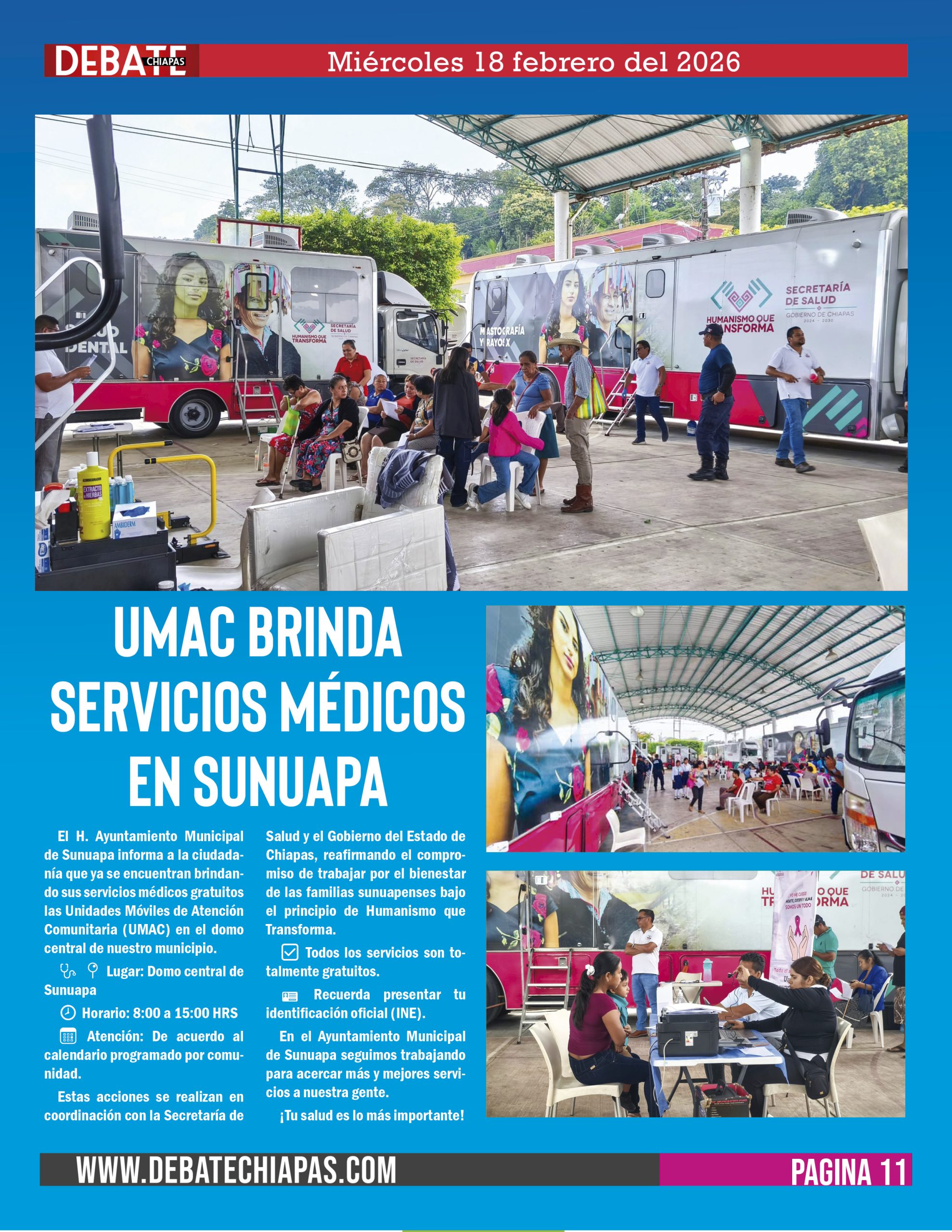 El H. Ayuntamiento Municipal de Sunuapa informa a la ciudadanía que ya se encuentran brindando sus servicios médicos gratuitos las Unidades Móviles de Atención Comunitaria (UMAC) en el domo central de nuestro municipio.
