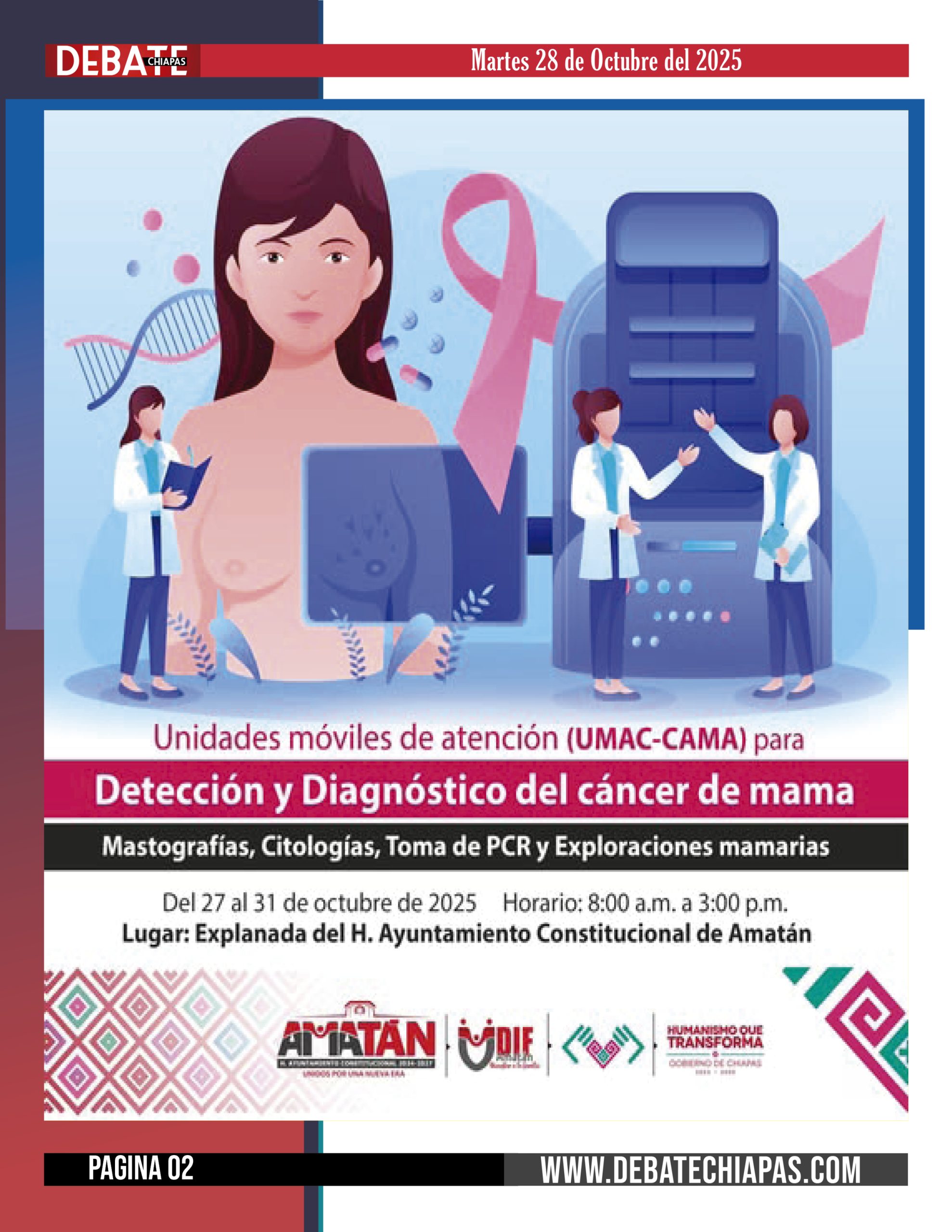 El H. Ayuntamiento Constitucional de Amatán, que preside el amigo del pueblo Majin Aguilar, en coordinación con la Jurisdicción Sanitaria V Norte, hace una invitación especial a todas las mujeres amatecas a la jornada de atención comunitaria (UMAC-CAMA) para la detección y diagnóstico del cáncer de mama.
