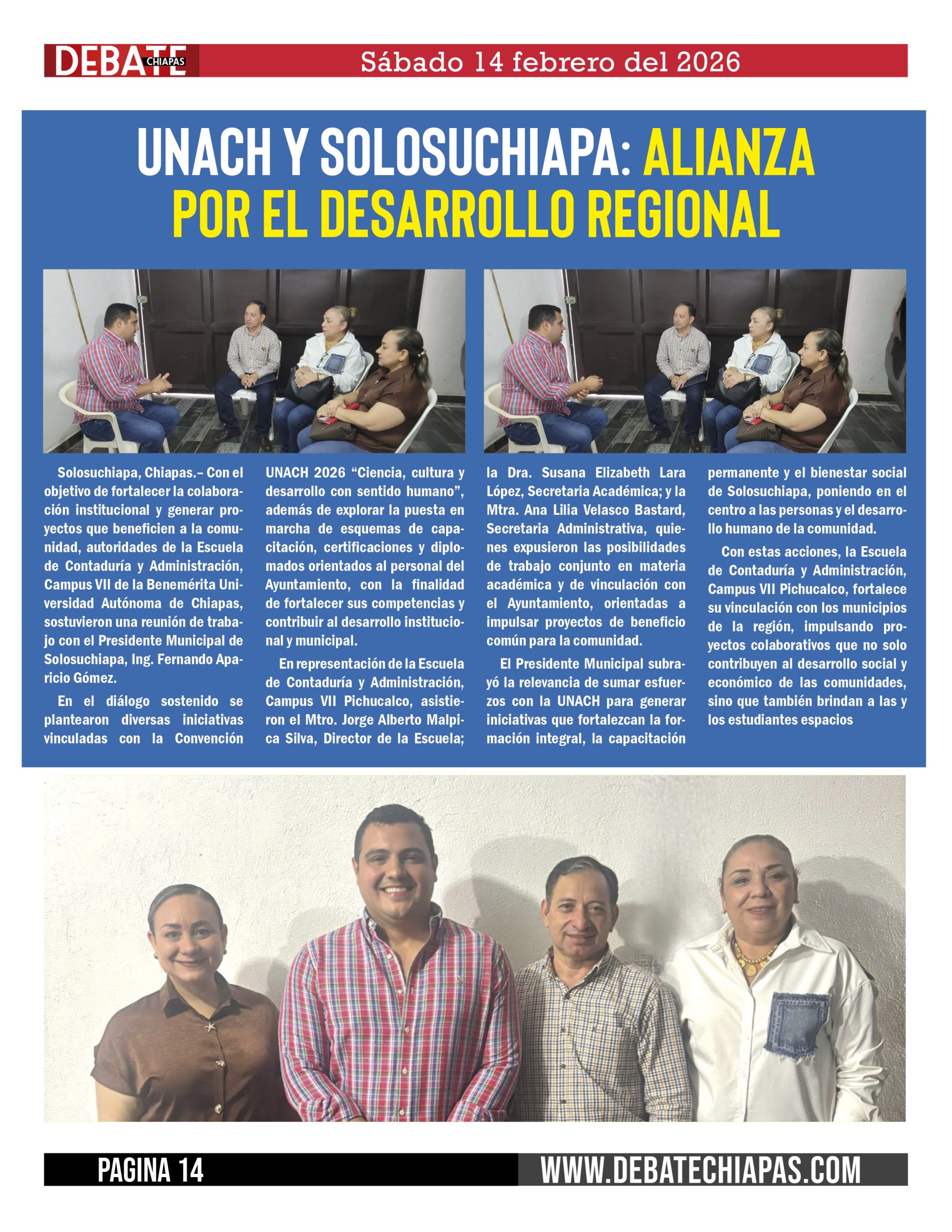 En representación de la Escuela de Contaduría y Administración, Campus VII Pichucalco, asistieron el Mtro. Jorge Alberto Malpica Silva, Director de la Escuela; la Dra. Susana Elizabeth Lara López, Secretaria Académica; y la Mtra. Ana Lilia Velasco Bastard, Secretaria Administrativa, quienes expusieron las posibilidades de trabajo conjunto en materia académica y de vinculación con el Ayuntamiento, orientadas a impulsar proyectos de beneficio común para la comunidad.