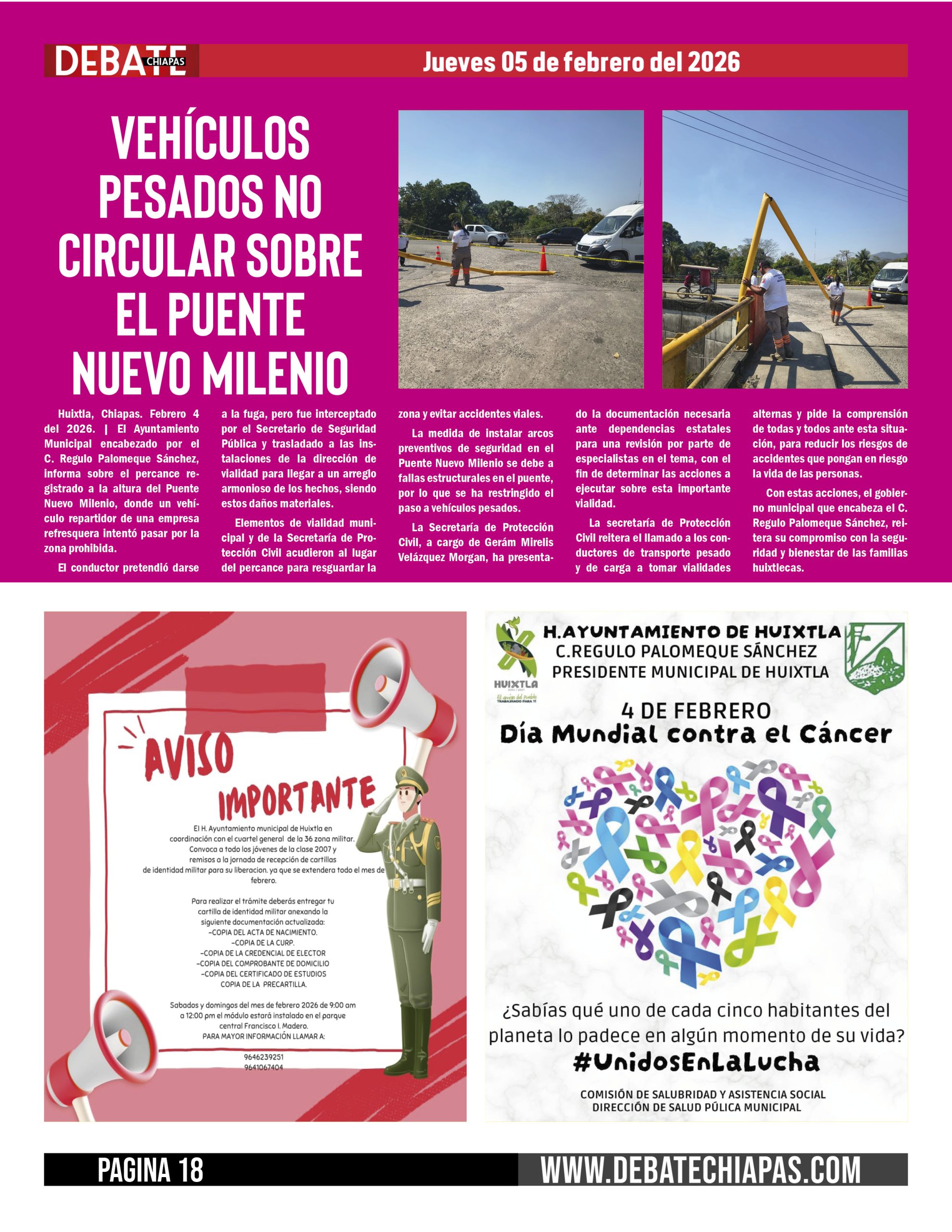Huixtla, Chiapas. Febrero 4 del 2026. | El Ayuntamiento Municipal encabezado por el C. Regulo Palomeque Sánchez, informa sobre el percance registrado a la altura del Puente Nuevo Milenio, donde un vehículo repartidor de una empresa refresquera intentó pasar por la zona prohibida.