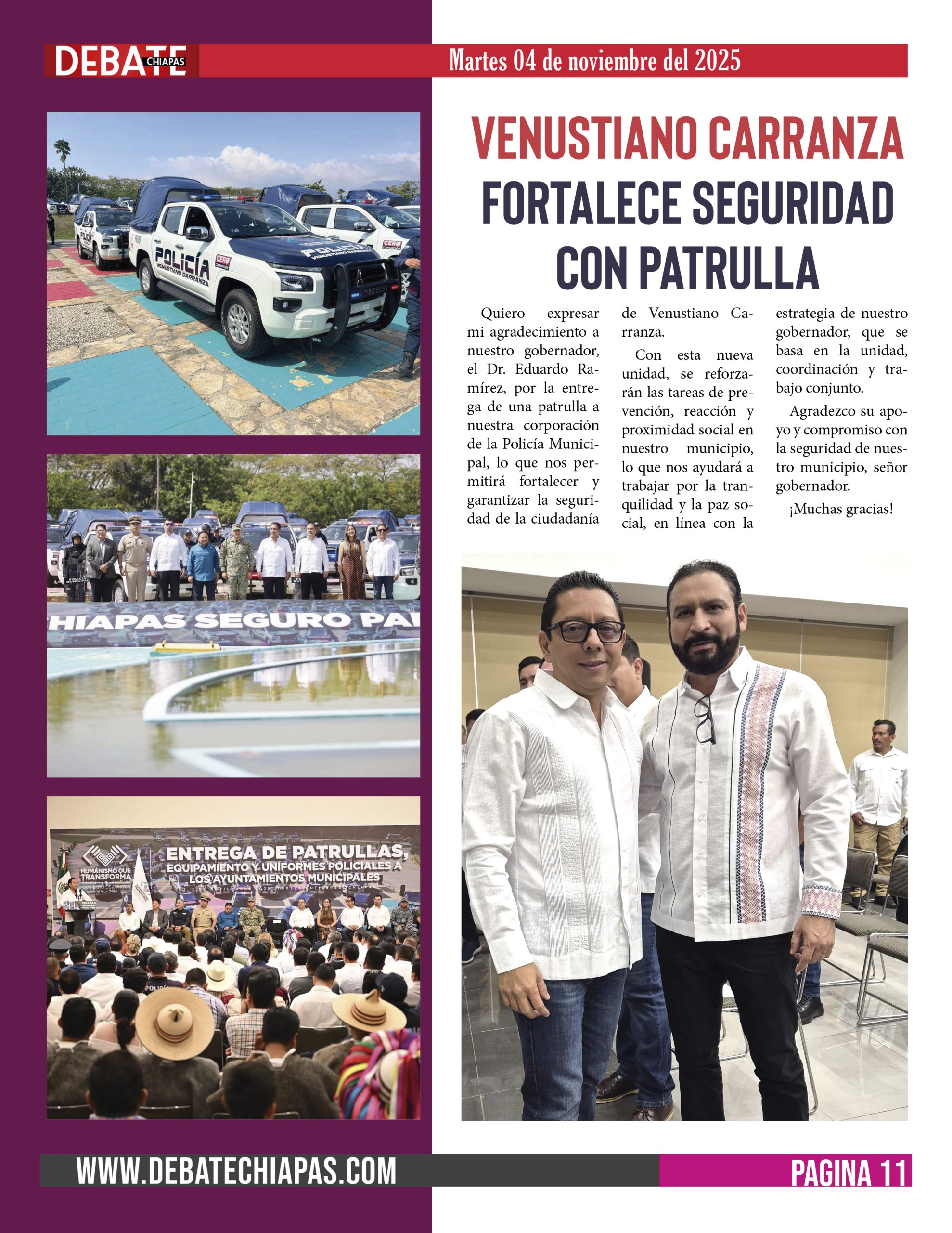 Quiero expresar mi agradecimiento a nuestro gobernador, el Dr. Eduardo Ramírez, por la entrega de una patrulla a nuestra corporación de la Policía Municipal, lo que nos permitirá fortalecer y garantizar la seguridad de la ciudadanía de Venustiano Carranza.