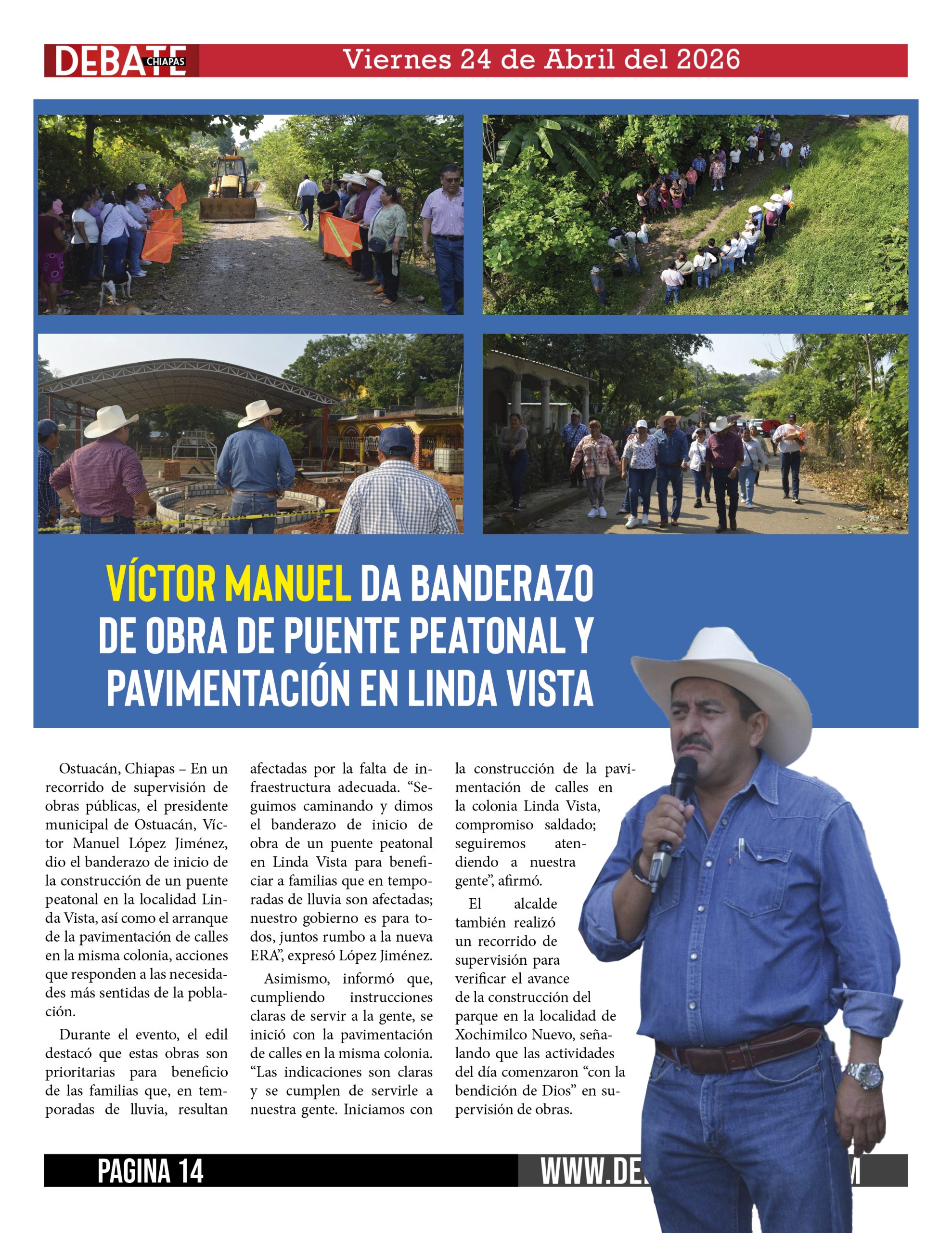 Ostuacán, Chiapas – En un recorrido de supervisión de obras públicas, el presidente municipal de Ostuacán, Víctor Manuel López Jiménez, dio el banderazo de inicio de la construcción de un puente peatonal en la localidad Linda Vista, así como el arranque de la pavimentación de calles en la misma colonia, acciones que responden a las necesidades más sentidas de la población.