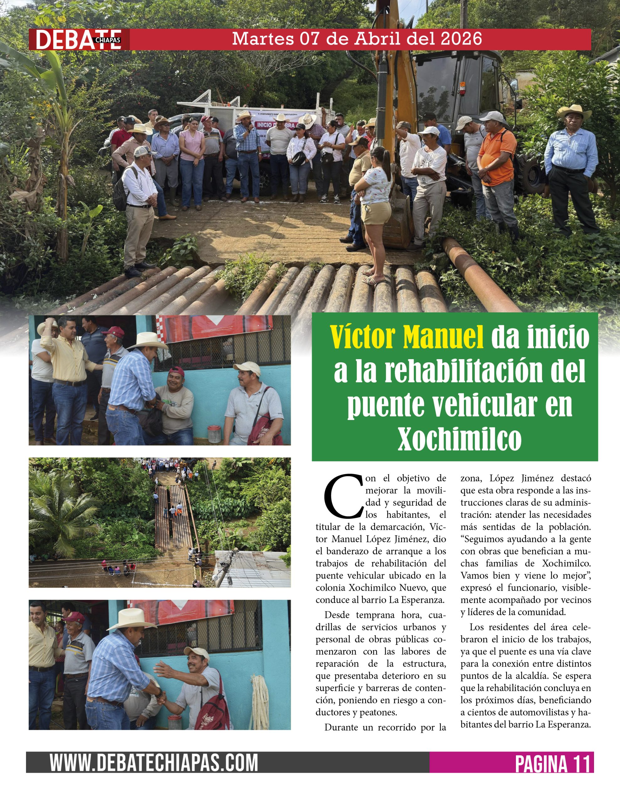 Con el objetivo de mejorar la movilidad y seguridad de los habitantes, el titular de la demarcación, Víctor Manuel López Jiménez, dio el banderazo de arranque a los trabajos de rehabilitación del puente vehicular ubicado en la colonia Xochimilco Nuevo, que conduce al barrio La Esperanza.