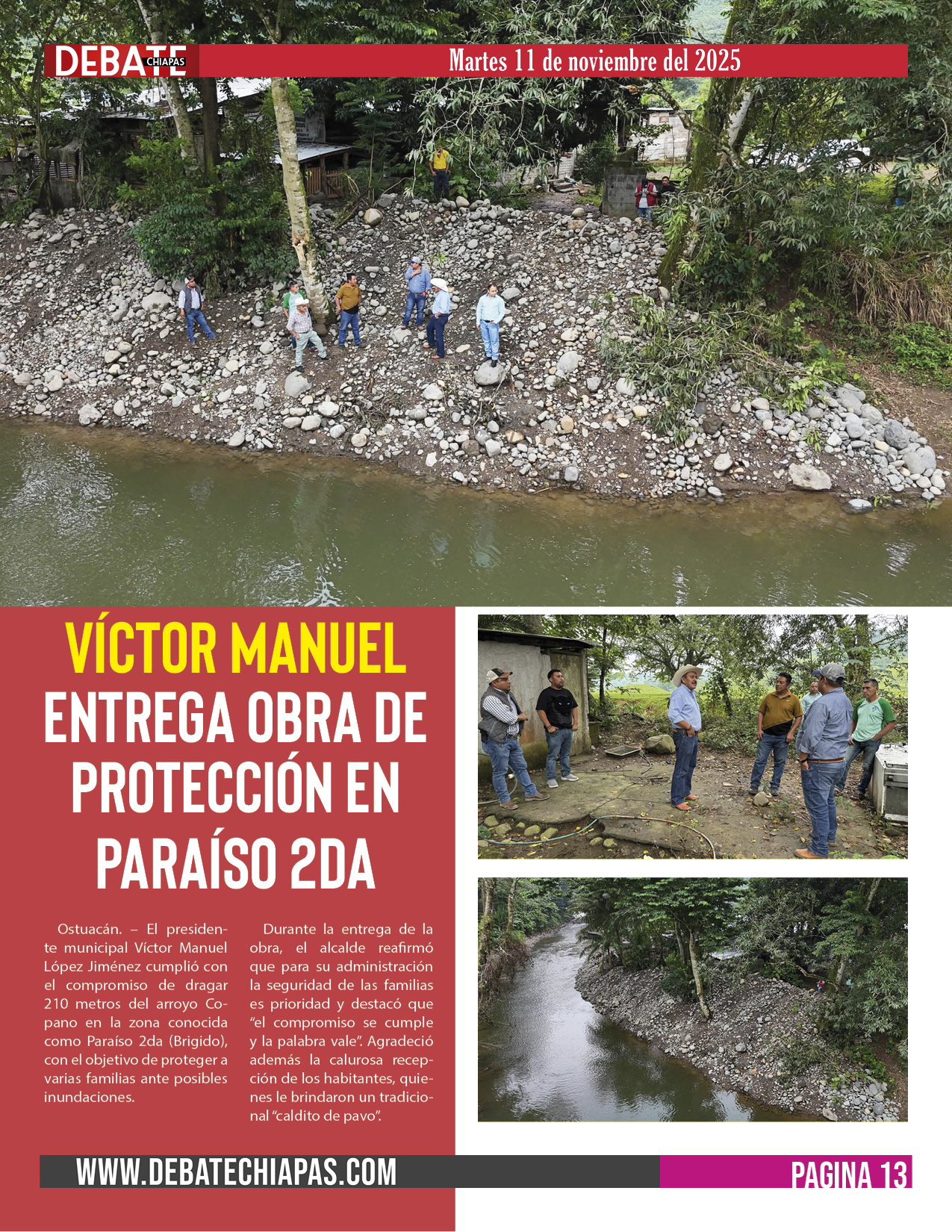 Ostuacán. – El presidente municipal Víctor Manuel López Jiménez cumplió con el compromiso de dragar 210 metros del arroyo Copano en la zona conocida como Paraíso 2da (Brigido), con el objetivo de proteger a varias familias ante posibles inundaciones.