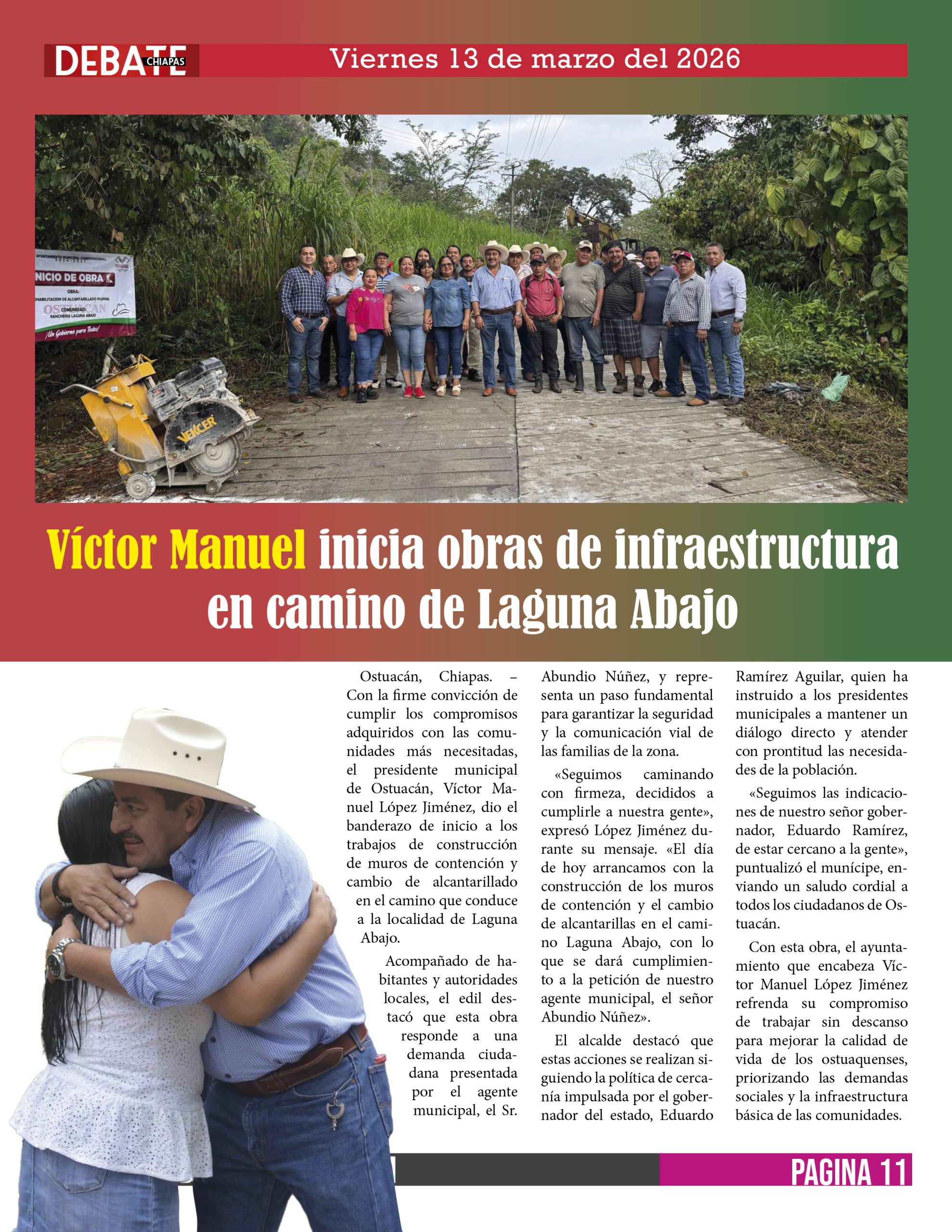 Ostuacán, Chiapas. – Con la firme convicción de cumplir los compromisos adquiridos con las comunidades más necesitadas, el presidente municipal de Ostuacán, Víctor Manuel López Jiménez, dio el banderazo de inicio a los trabajos de construcción de muros de contención y cambio de alcantarillado en el camino que conduce a la localidad de Laguna Abajo.
