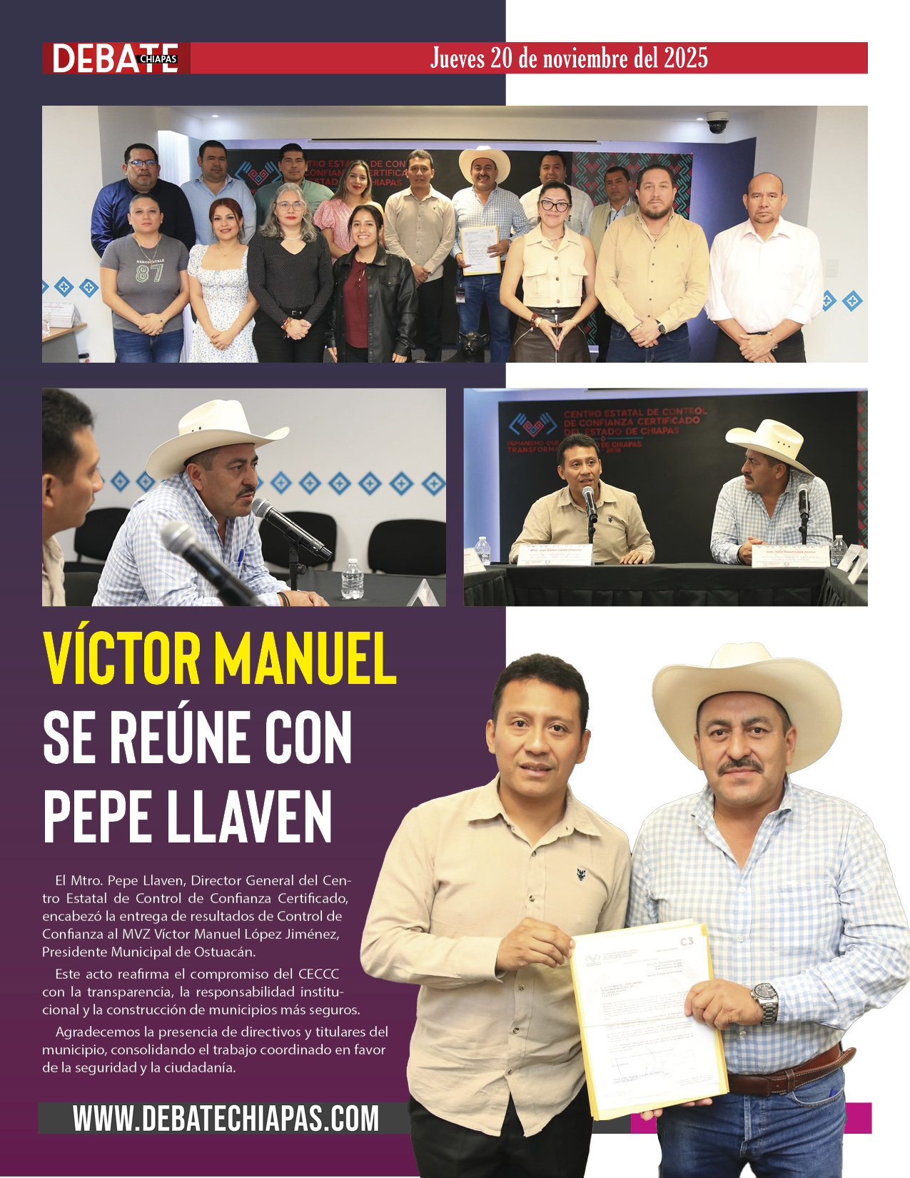 El Mtro. Pepe Llaven, Director General del Centro Estatal de Control de Confianza Certificado, encabezó la entrega de resultados de Control de Confianza al MVZ Víctor Manuel López Jiménez, Presidente Municipal de Ostuacán.