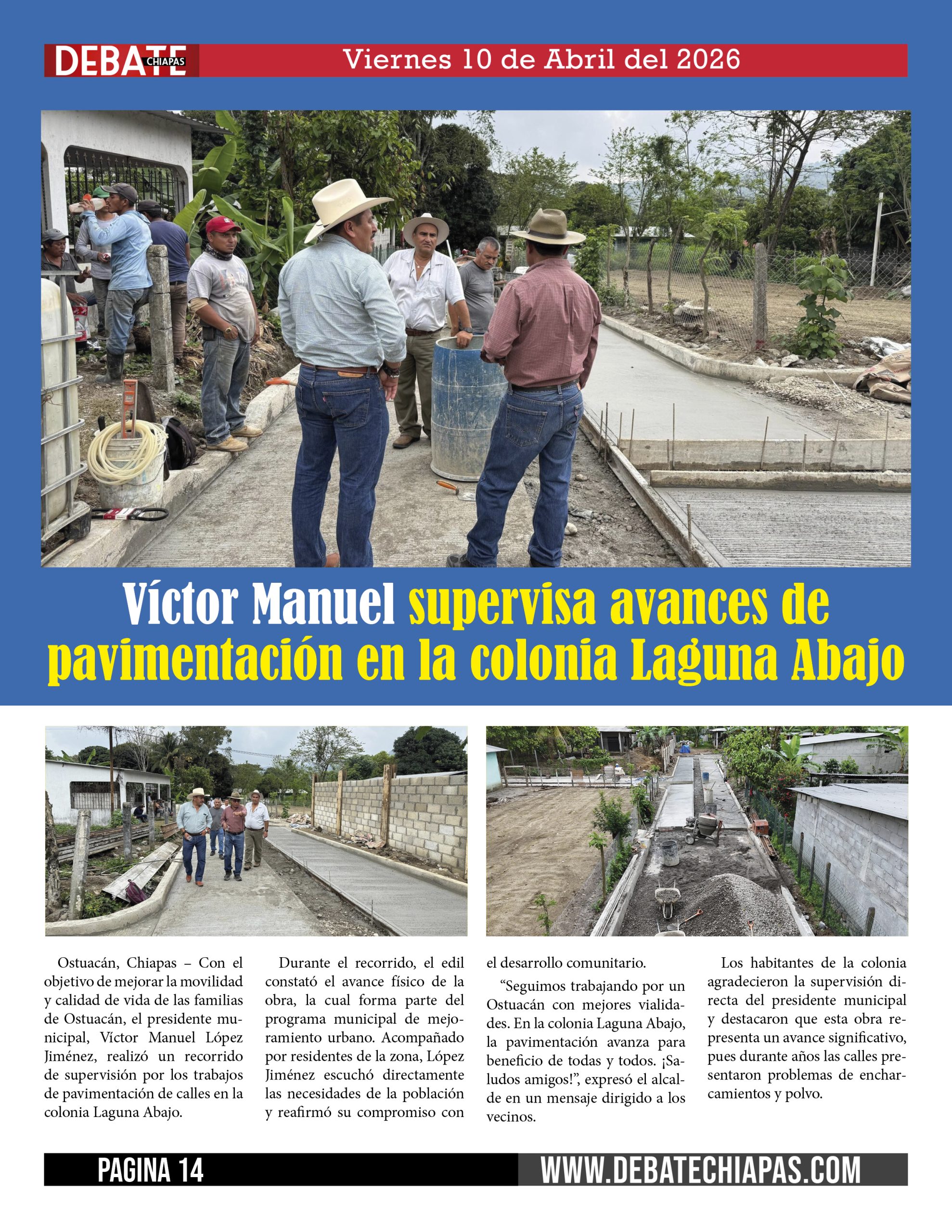“Seguimos trabajando por un Ostuacán con mejores vialidades. En la colonia Laguna Abajo, la pavimentación avanza para beneficio de todas y todos. ¡Saludos amigos!”, expresó el alcalde en un mensaje dirigido a los vecinos.