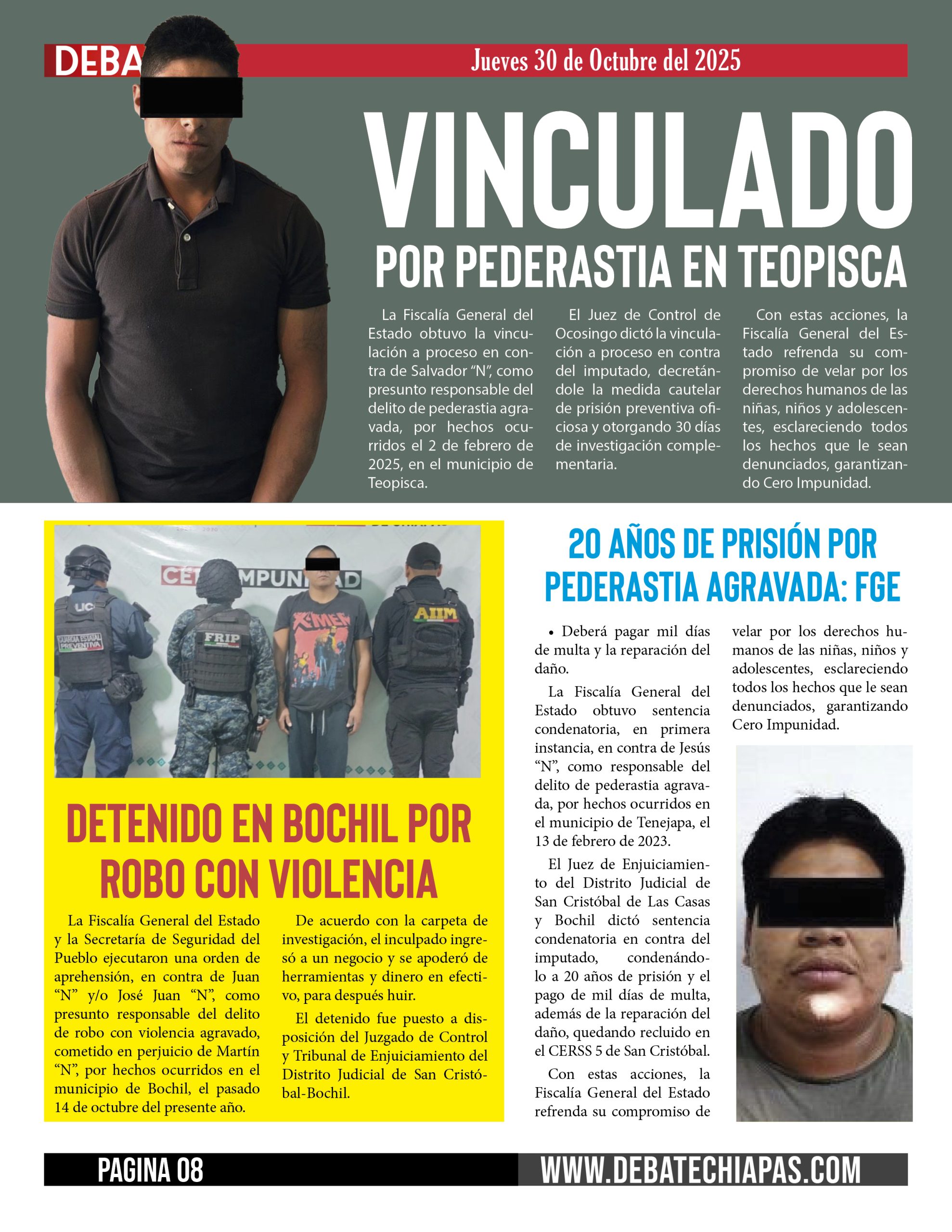La Fiscalía General del Estado obtuvo la vinculación a proceso en contra de Salvador “N”, como presunto responsable del delito de pederastia agravada, por hechos ocurridos el 2 de febrero de 2025, en el municipio de Teopisca.