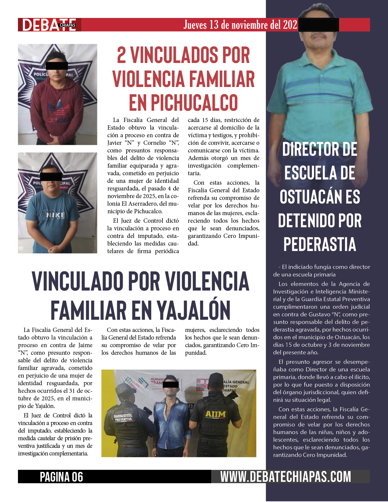 La Fiscalía General del Estado obtuvo la vinculación a proceso en contra de Jaime “N”, como presunto responsable del delito de violencia familiar agravada, cometido en perjuicio de una mujer de identidad resguardada, por hechos ocurridos el 31 de octubre de 2025, en el municipio de Yajalón.