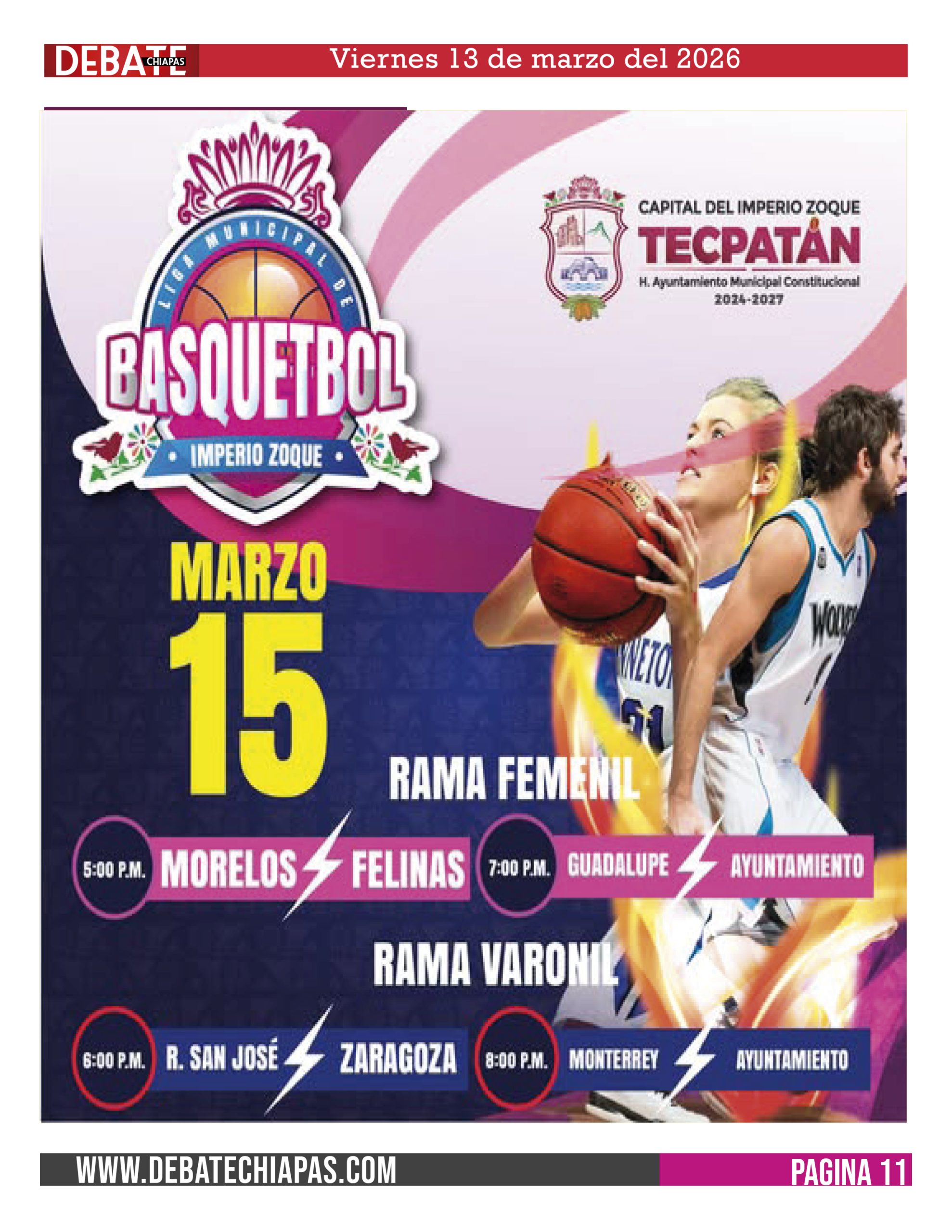Asiste a los encuentros de la Liga Municipal de Basquetbol Femenil y Varonil, este domingo 15 de marzo, en la cancha Santa Lucía, a partir de las 5:00 de la tarde.