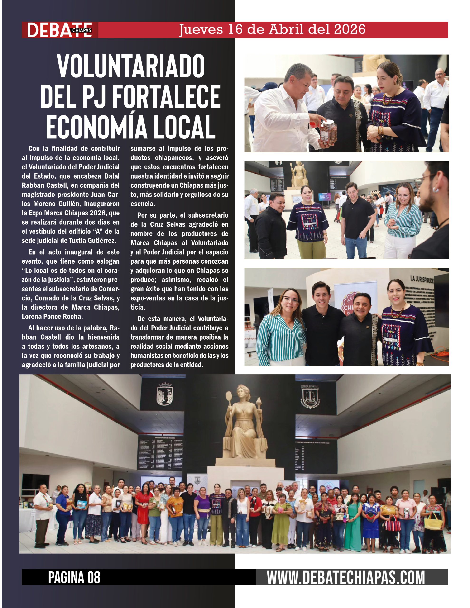 Con la finalidad de contribuir al impulso de la economía local, el Voluntariado del Poder Judicial del Estado, que encabeza Dalal Rabban Castell, en compañía del magistrado presidente Juan Carlos Moreno Guillén, inauguraron la Expo Marca Chiapas 2026, que se realizará durante dos días en el vestíbulo del edificio “A” de la sede judicial de Tuxtla Gutiérrez.