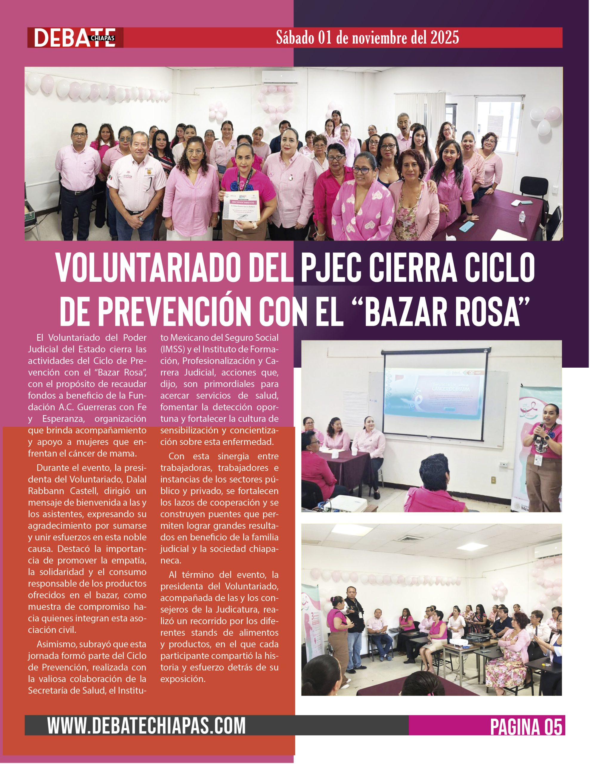El Voluntariado del Poder Judicial del Estado cierra las actividades del Ciclo de Prevención con el “Bazar Rosa”, con el propósito de recaudar fondos a beneficio de la Fundación A.C. Guerreras con Fe y Esperanza, organización que brinda acompañamiento y apoyo a mujeres que enfrentan el cáncer de mama.