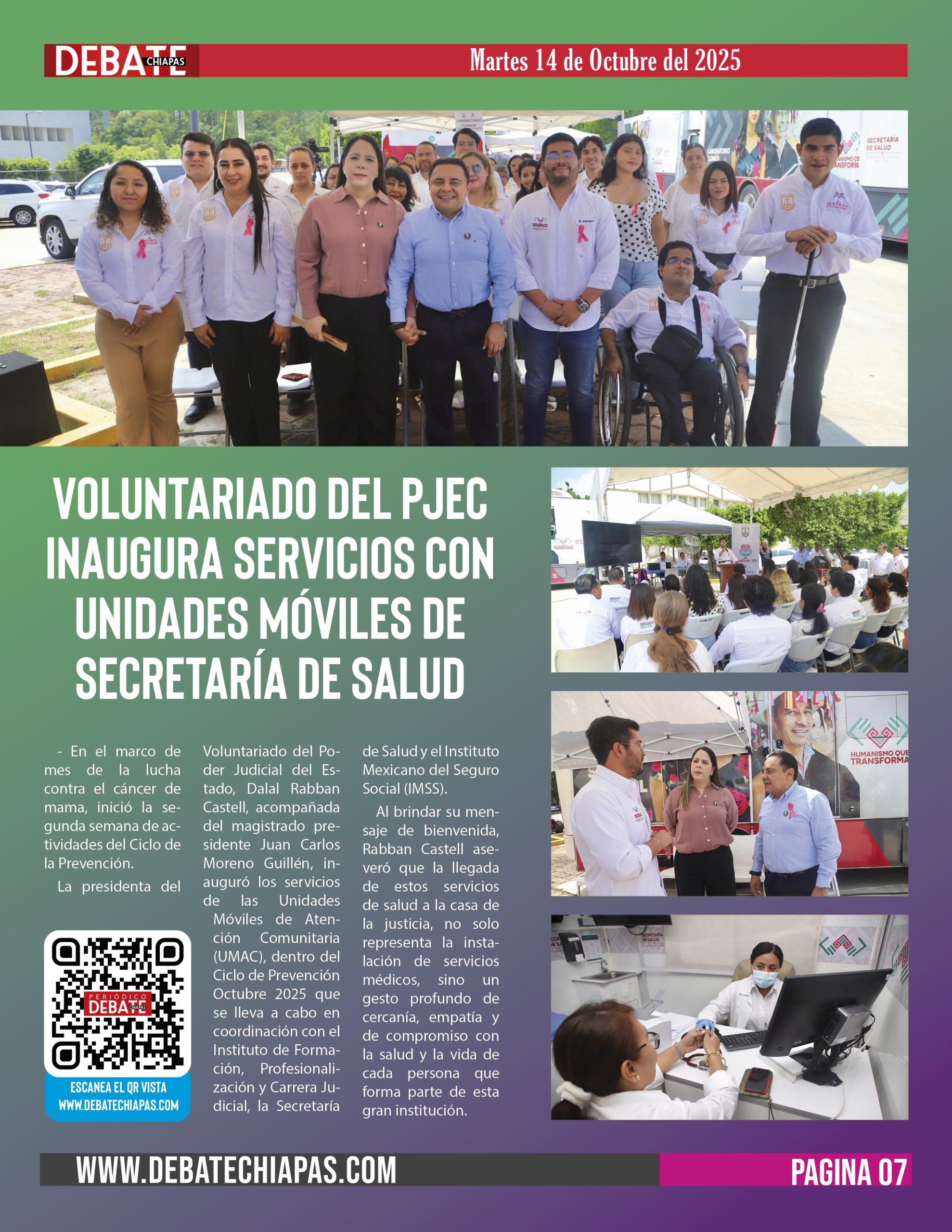 La presidenta del Voluntariado del Poder Judicial del Estado, Dalal Rabban Castell, acompañada del magistrado presidente Juan Carlos Moreno Guillén, inauguró los servicios de las Unidades Móviles de Atención Comunitaria (UMAC), dentro del Ciclo de Prevención Octubre 2025 que se lleva a cabo en coordinación con el Instituto de Formación, Profesionalización y Carrera Judicial, la Secretaría de Salud y el Instituto Mexicano del Seguro Social (IMSS).