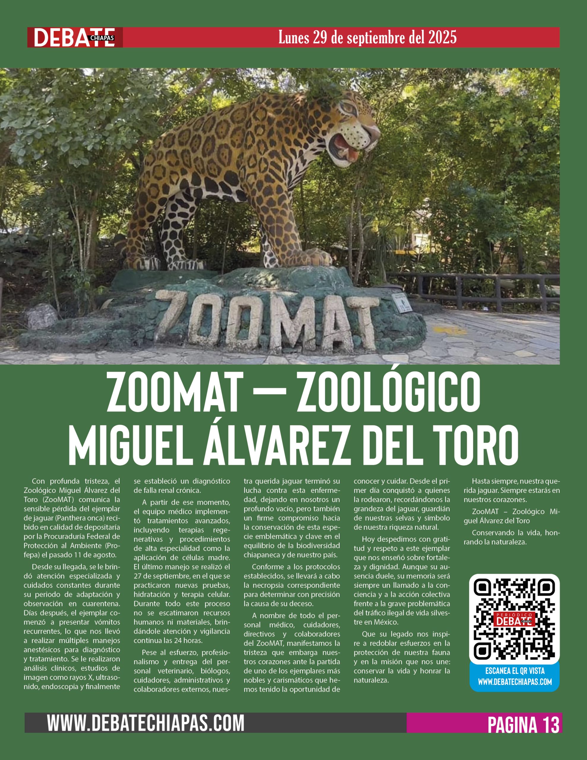 Con profunda tristeza, el Zoológico Miguel Álvarez del Toro (ZooMAT) comunica la sensible pérdida del ejemplar de jaguar (Panthera onca) recibido en calidad de depositaría por la Procuraduría Federal de Protección al Ambiente (Profepa) el pasado 11 de agosto.
